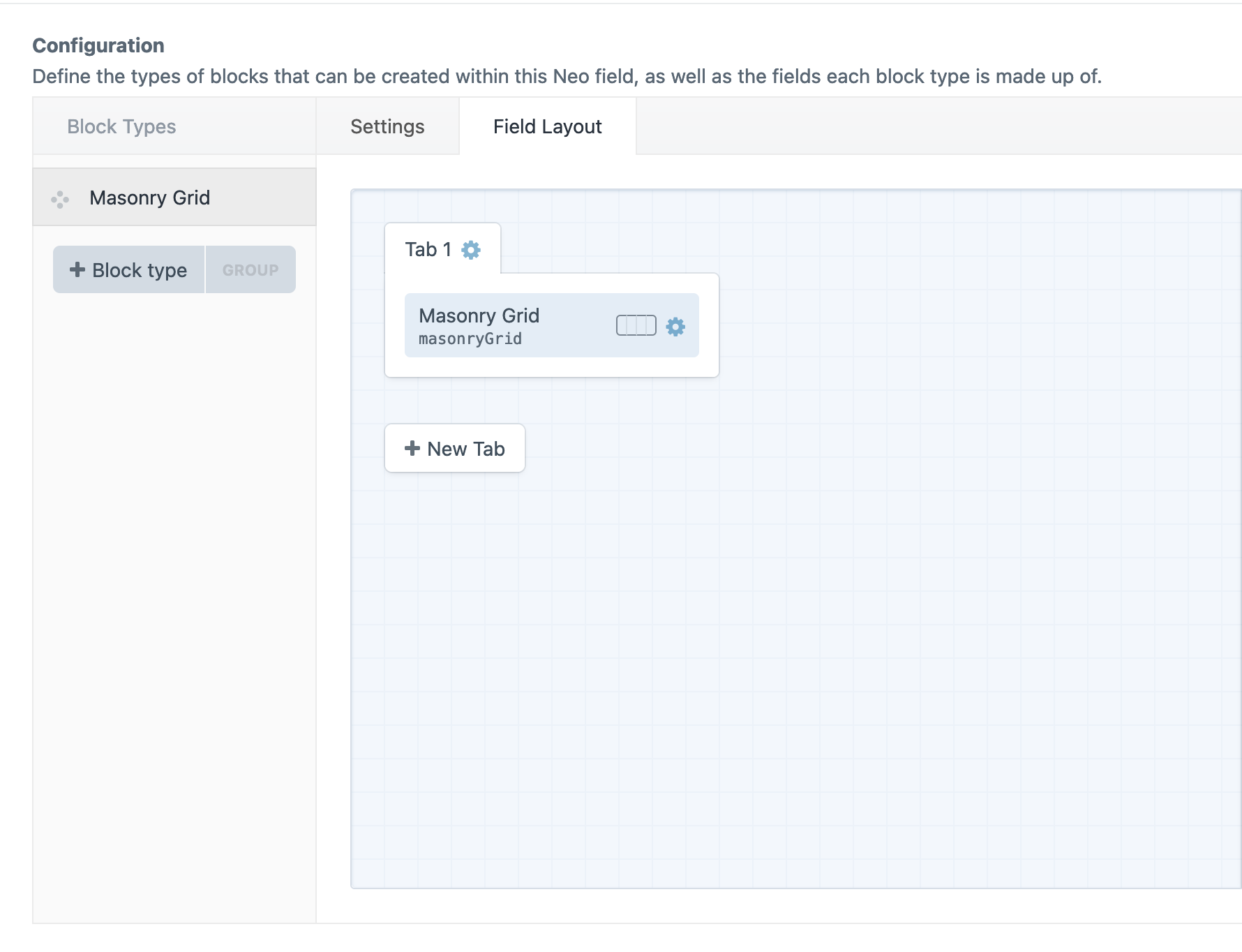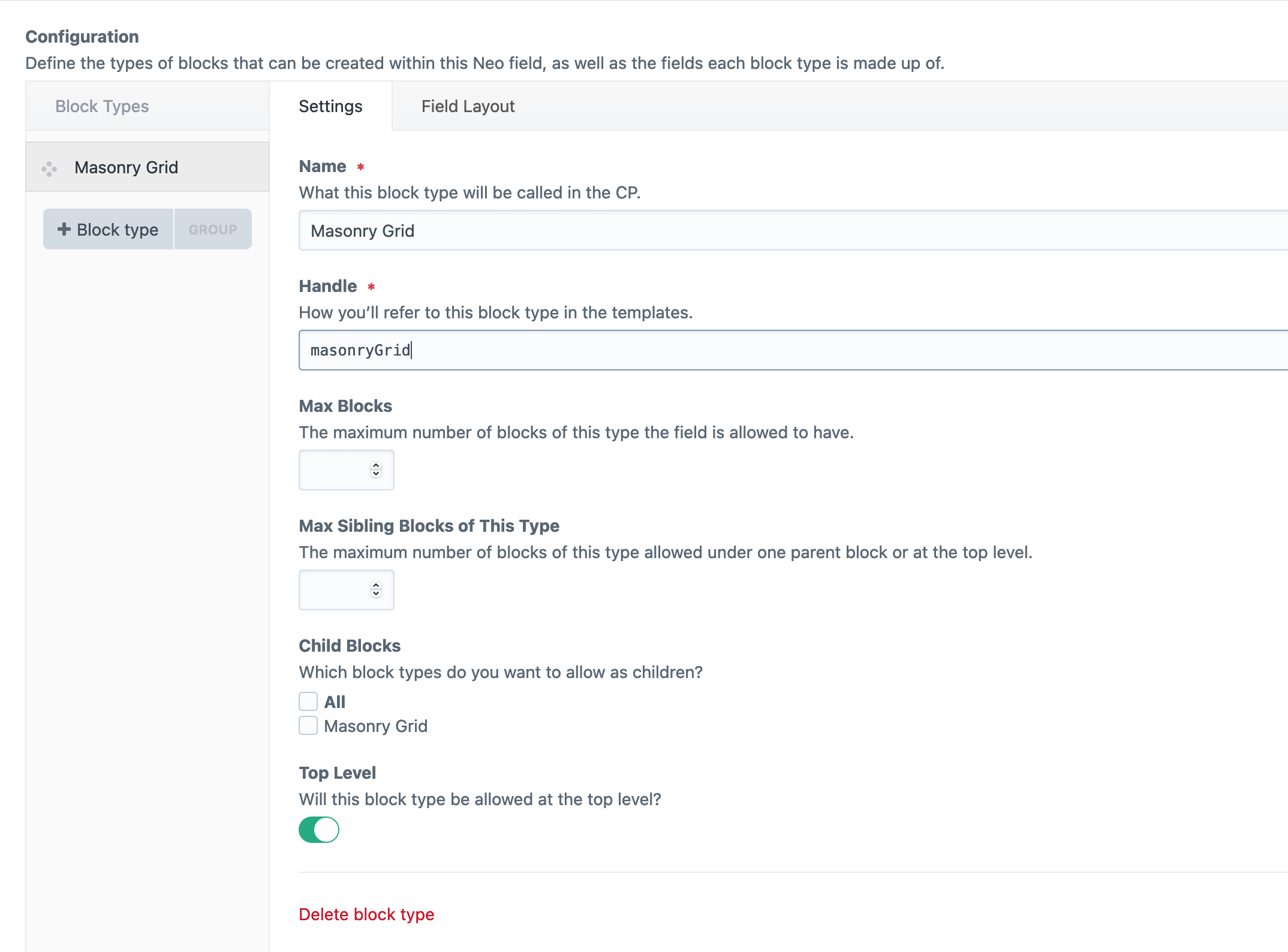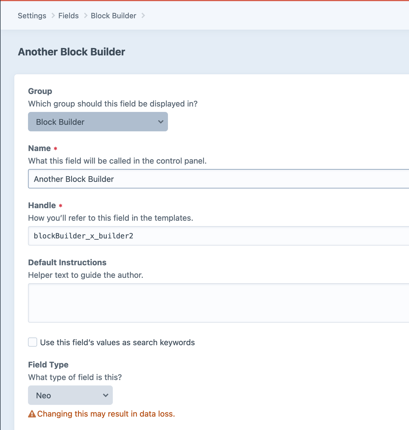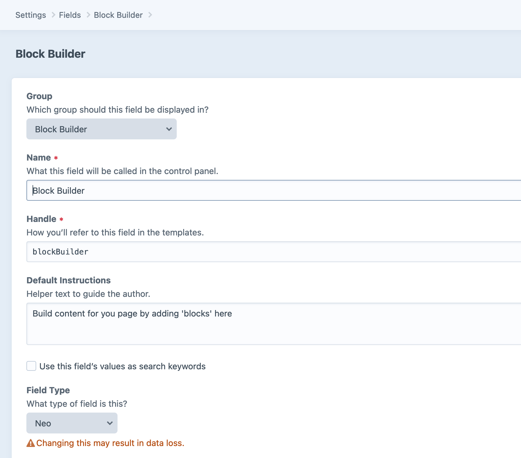 Add a block to the new Block Builder - Add a NEO block type to our new Block Builder field. The name of this new Neo Block type should be the same as it's field name e.g.